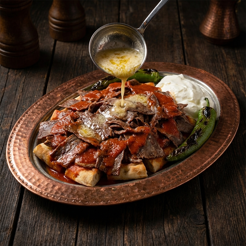 Kıtır pide üzerinde döner, özel domates sosu, kızgın tereyağı ve yanında yoğurt ile Bursa klasiği.