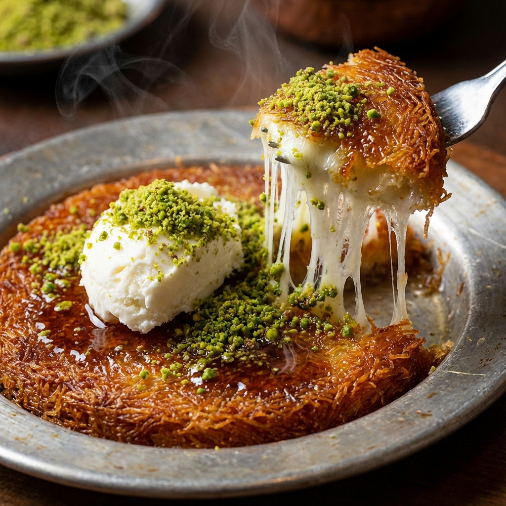 Hatay peyniri ile hazırlanan, bol fıstıklı ve şerbetli çıtır künefe.