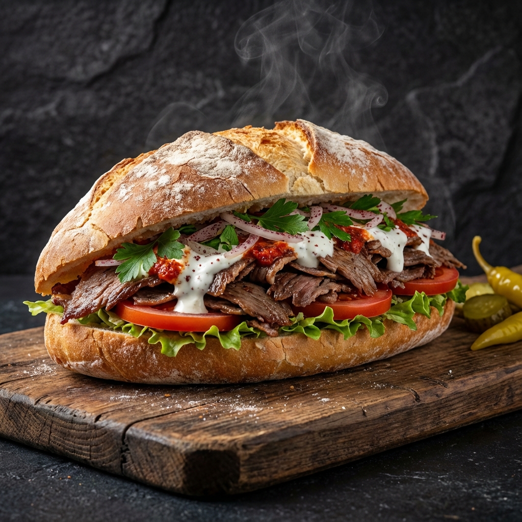 Özel soslu taze ekmek içerisinde, odun ateşinde pişmiş gerçek yaprak döner. Domates, turşu ve isteğe bağlı soğan ile servis edilir.